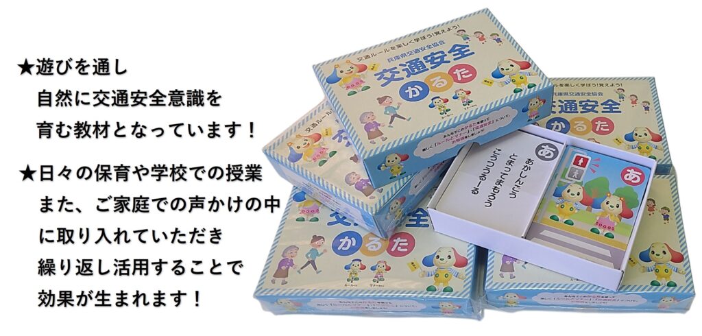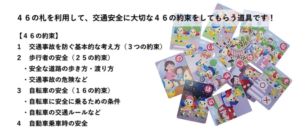 ひらがなの46文字から、46の交通安全パターンを札にし、子どもたちと46の約束をしてもらう道具です。